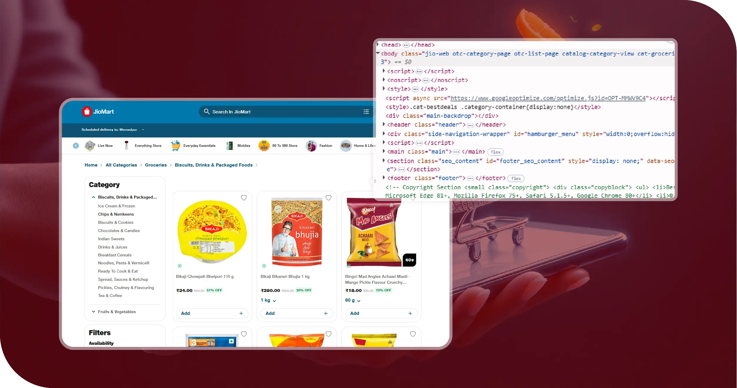 - Challenge in Obtaining Location-Specific Listings – The client faced difficulties scraping grocery product listings from JioMart by pincode efficiently. Manual collection methods were slow, prone to errors, and failed to deliver timely, localized insights essential for effective inventory planning and competitive positioning.