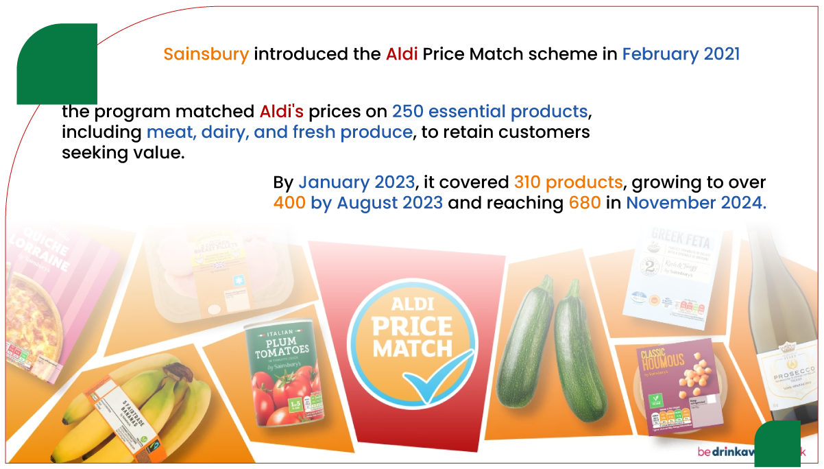 4. Market Dynamics and Future Outlook: The Aldi Price Match initiative reflects broader market trends, including heightened competition and evolving consumer priorities. Aldi's growth had slowed to 2.2% year-on-year by May 2024, suggesting that Sainsbury's focus on price-matching and loyalty schemes is helping retain customers. The initiative's expansion to convenience stores and including seasonal products like prosecco and dips demonstrate adaptability to changing consumer needs.