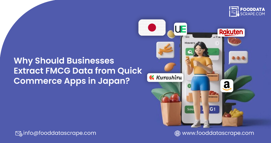 Japan's Fast-Moving Consumer Goods (FMCG) industry is experiencing fast digital evolution powered by the popularity of quick commerce apps. Uber Eats, Rakuten Seiyu, Amazon Fresh, Kurashiru, and Demae-can are transforming customer buying behavior. Companies looking to stay ahead in the competition must Extract FMCG Data from Quick Commerce Apps in Japan to make sense of price trends, inventory levels, and consumer behaviors. Web Scraping Quick Commerce Data enables businesses to track market demand, streamline supply chains, and strengthen product offerings. Also, Grocery Data Scraping enables businesses to improve data-oriented marketing strategies and reduce operational inefficiency. Nevertheless, data extraction on these platforms entails challenges like data accessibility constraints and compliance issues. Despite these challenges, businesses leveraging FMCG data can make better decisions, optimize pricing strategies, and lead the way in Japan's developing quick commerce market.