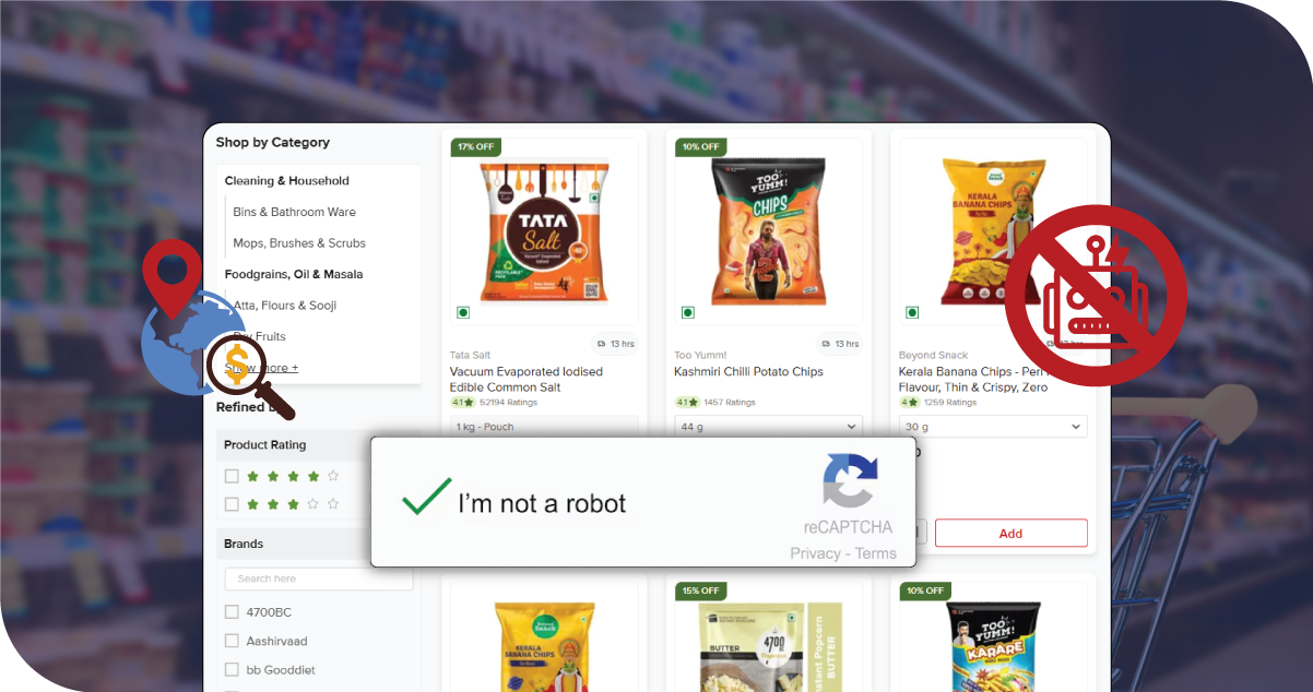 Extracting data from grocery websites is complex due to dynamic pricing, CAPTCHA restrictions, anti-bot mechanisms, and geographical price variations. Food Data Scrape overcomes these challenges using: