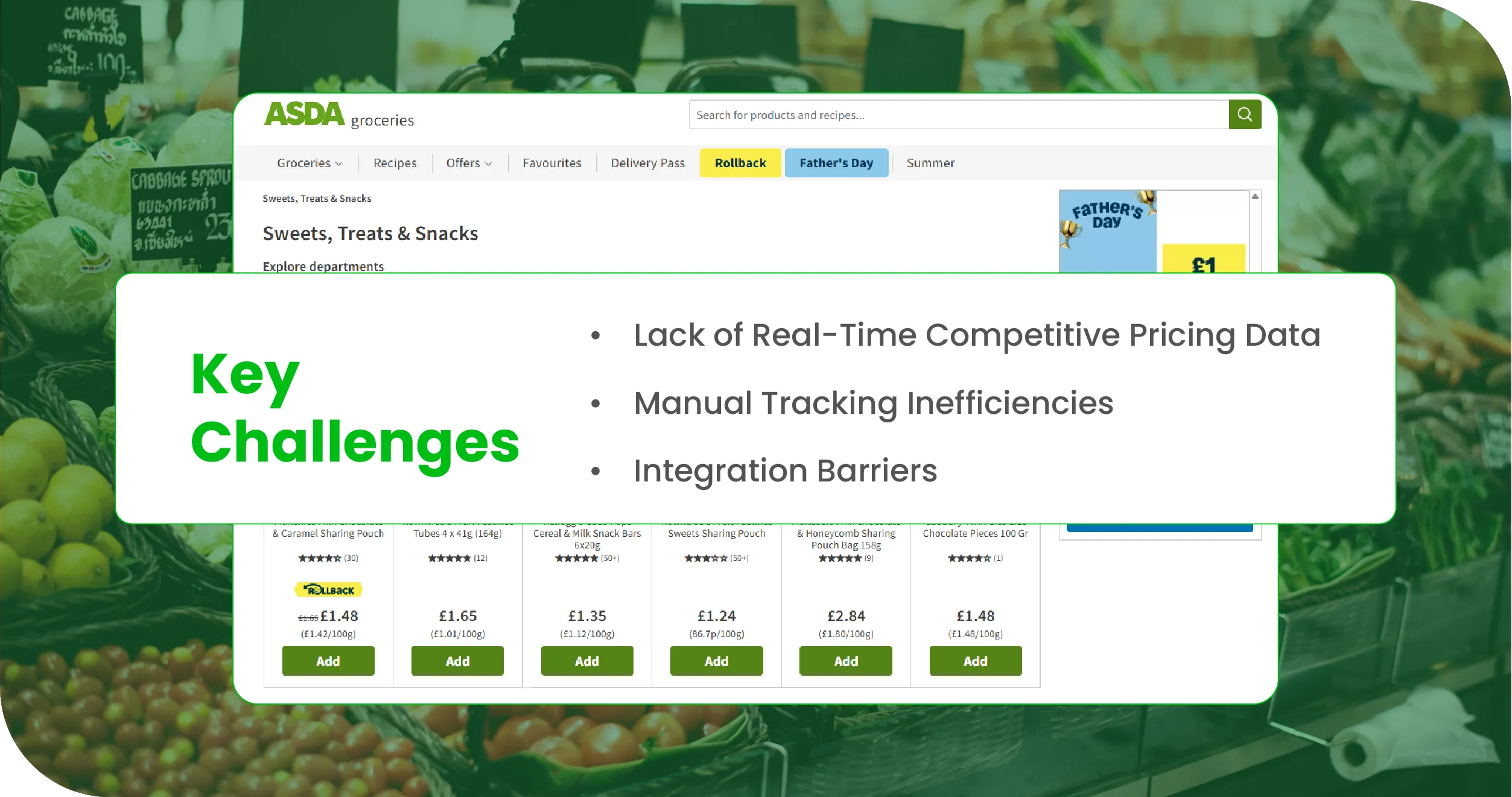 Lack of Real-Time Competitive Pricing Data: The client struggled to monitor fast-changing prices across ASDA's platform, limiting their ability to respond quickly to market fluctuations and promotions listed in the ASDA Groceries and Liquor Dataset.