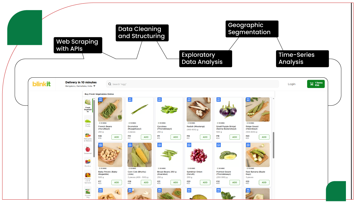 The research employed a combination of quantitative and qualitative methodologies to extract and analyze Blinkit's CPG sales data, ensuring comprehensive insights into e-grocery trends. The methodologies included: