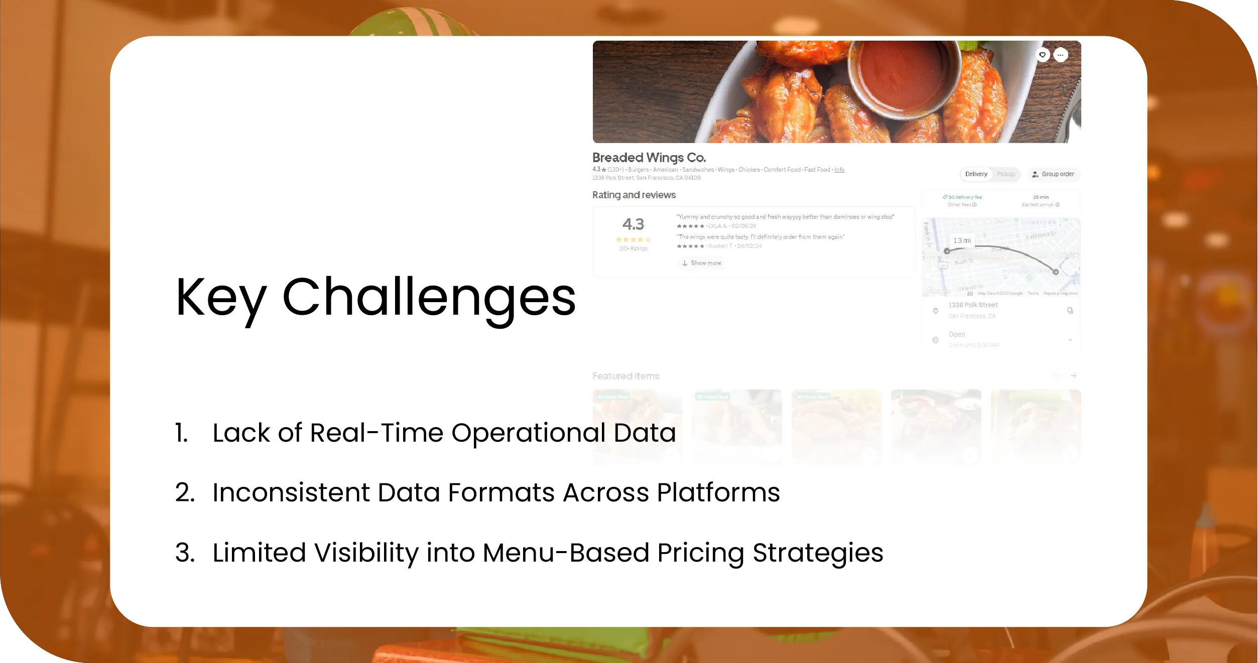 1. Lack of Real-Time Operational Data: The client struggled to Scrape Food Delivery Apps for Operational Metrics, making it challenging to monitor competitors' delivery times, surge fees, and fulfillment patterns across various cities.