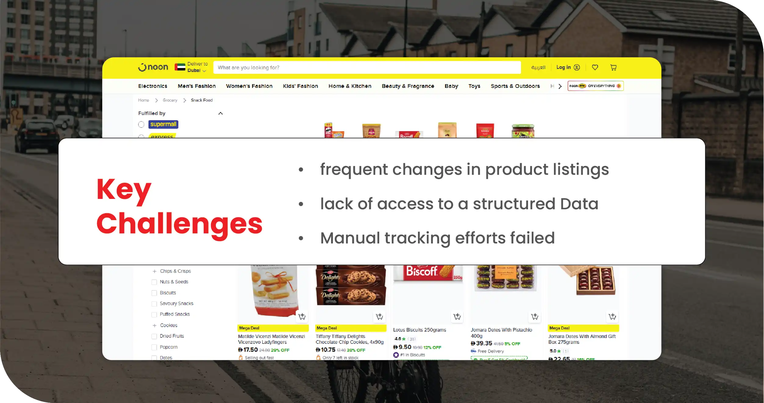 - The client struggled to Extract Grocery Data from Noon UAE consistently due to frequent changes in product listings, pricing structures, and category placements on the platform.
