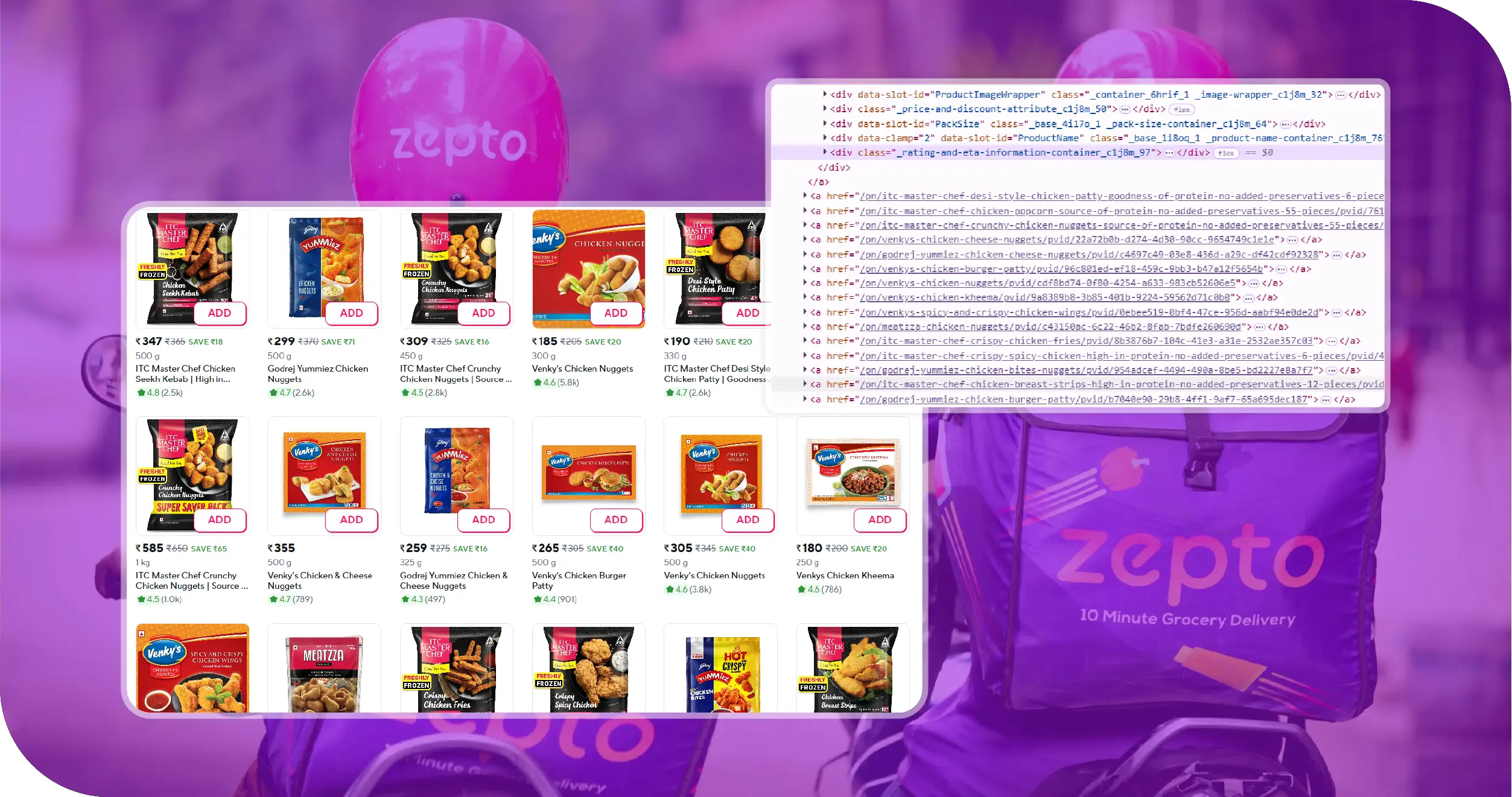 • Custom Data Pipeline for Zepto: We provided the client with tailored Grocery App Data Scraping Services that captured structured data on Zepto's grocery listings, helping them track product assortment, pricing, and stock availability with precision and speed across different regions.